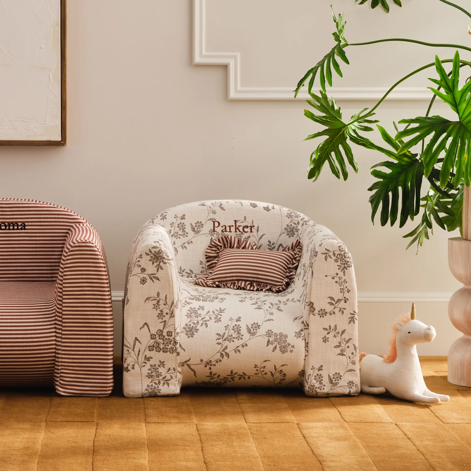 Cute on their own, but even better paired with soft furniture. Our rectangular ruffle pillows come in two sizes to fit our play chairs and play couches. Intentionally designed in prints and colors that complement your setup – easy, elevated, perfectly matched.